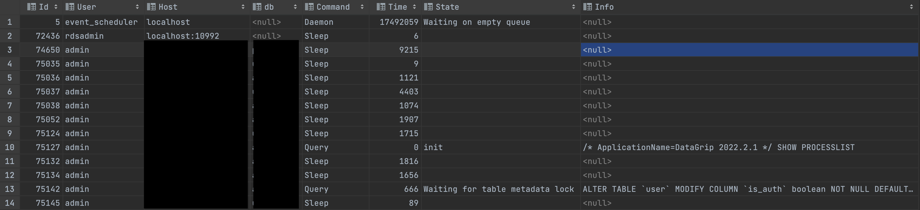 위와 같은 쿼리들을 통해 Lock 정보를 조회해봤는데 앞단에서 다른 metadata lock이 없음을 확인하였다.