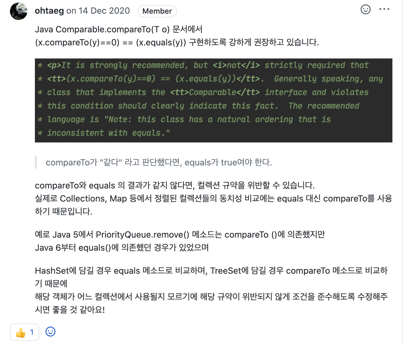 가끔 중복으로 드리는 내용 중 하나이며 compareTo를 재정의 시 equals()를 왜 함께 재정의 하는걸 권장하는지