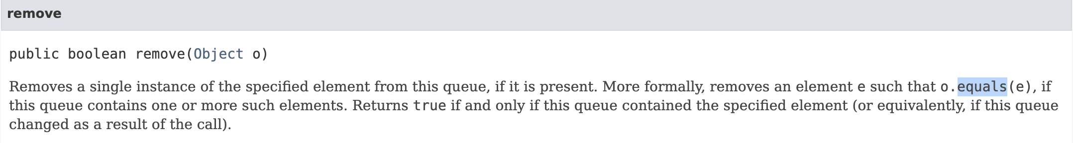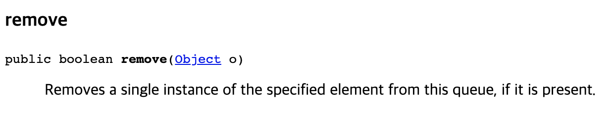 큐에 하나 이상의 해당 요소가 포함되어 있는 경우 요소 제거 시 eqauls를 통해 삭제한다.라는 내용을 확인할 수 있다.