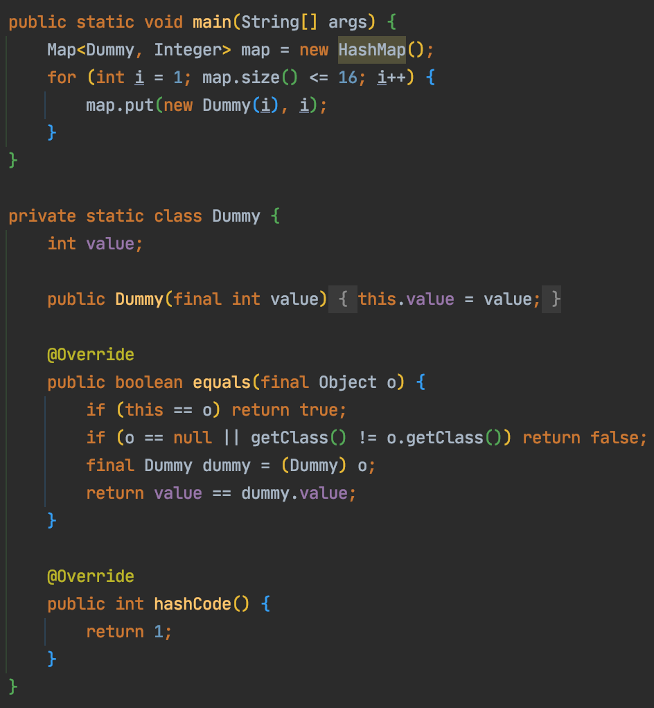 첫 번째 데이터인 map.put(new Dummy(1), 1); 을 수행하면 어떻게 되는지 확인해보자.