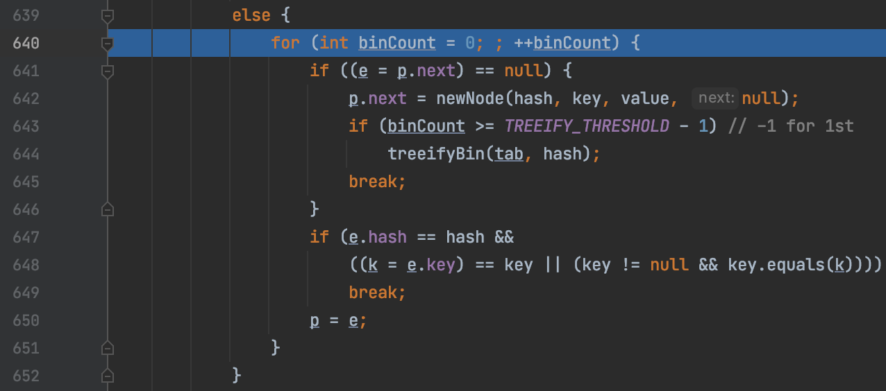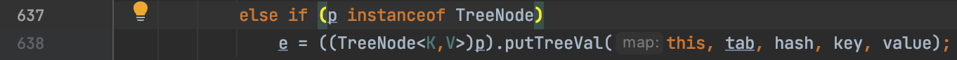 637 Line은 버킷이 링크드 리스트가 아닌 이미 트리로 변경되었을 때 트리노드인지 판단하고 트리노드라면 put 한다.
