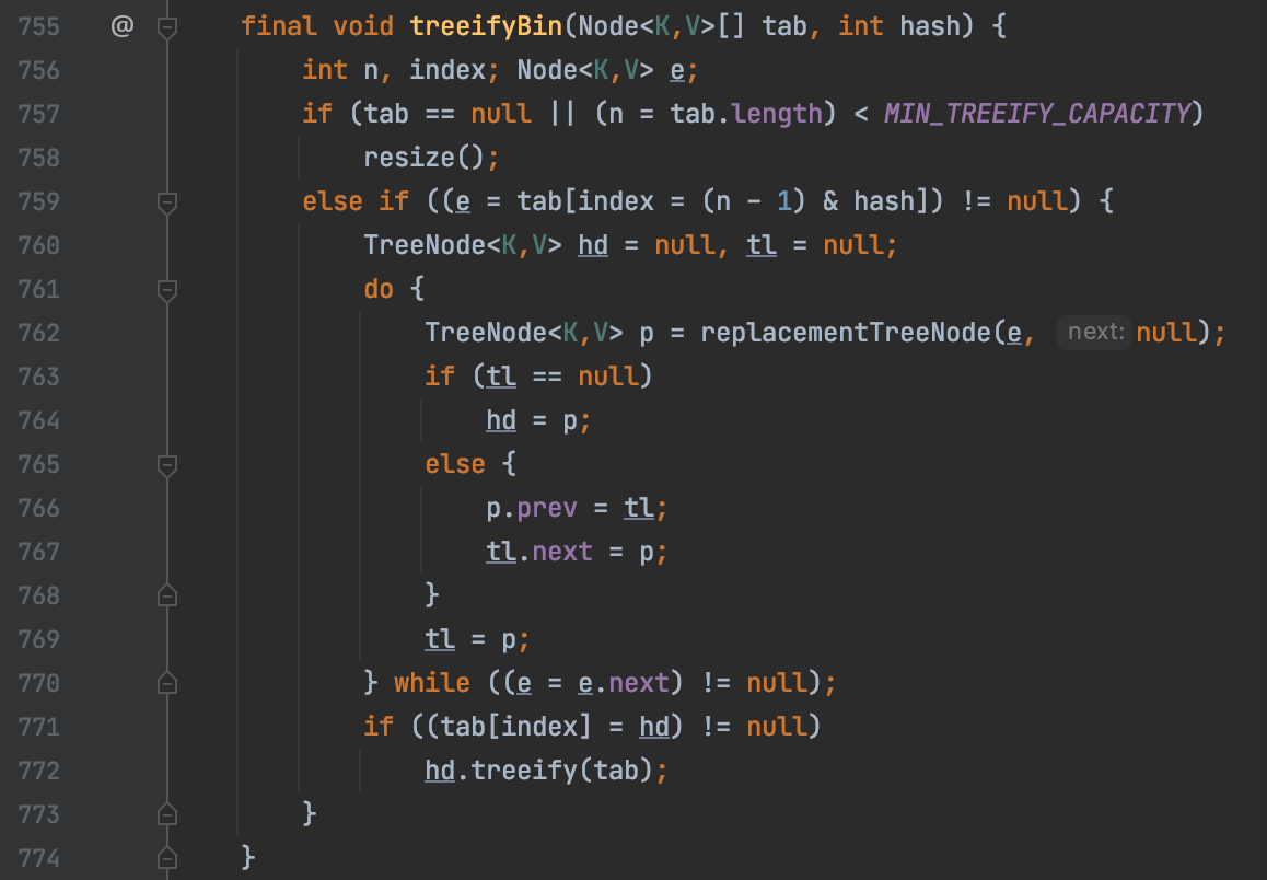 젤 중요한 부분이다. 이 else 문에서 treeifyBin()을 통해 트리로 변경된다는 것을 알 수 있다.