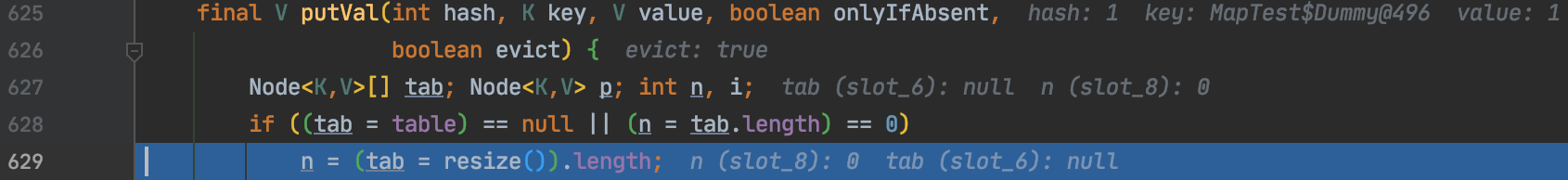 628 Line의 조건은 해시 맵 멤버 변수인 table을 지역변수인 tab에 옮기고 값이 들어있는지, 길이를 확인한다.